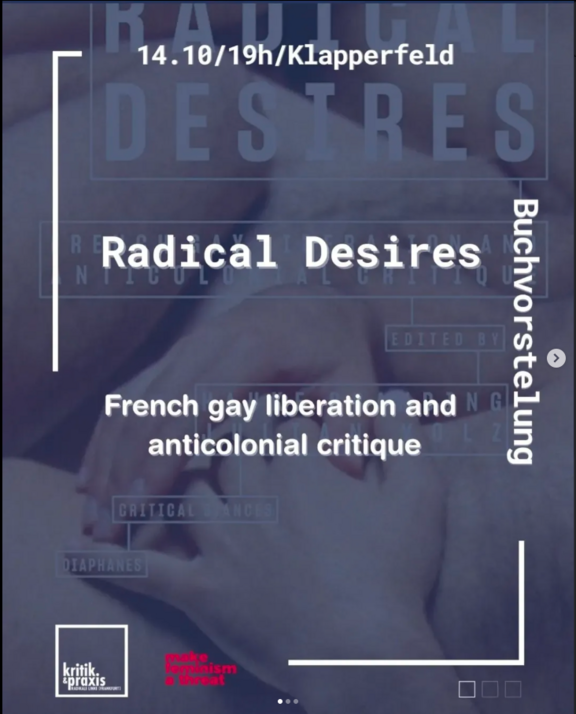 Radical Desires versammelt Beiträge, die die bemerkenswerten Entwürfe der beiden wohl bekanntesten Mitglieder des FHAR, Guy Hocquenghem und Monique Wittig, zu Begehren, Sexualität und der Überwindung der Geschlechterbinarität aufgreifen und sie zu gegenwärtigen Vorstellungen queerer Befreiung in Beziehung setzen.