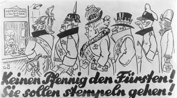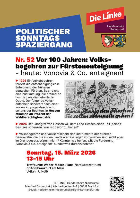 Heute: Vonovia & Co. enteignen!- 1926: Ein Volksbegehren fordert die entschädigungslose Enteignung der früheren deutschen Fürsten und erreicht eine Zustimmung, die dreimal so hoch ist wie die geforderte Quote. Der folgende Volksentscheid scheitert nach einer wilden Propagandaschlacht seitens der bürgerlichen Rechten. In Hessen stimmen 40 Prozent der Wahlberechtigten dafür.